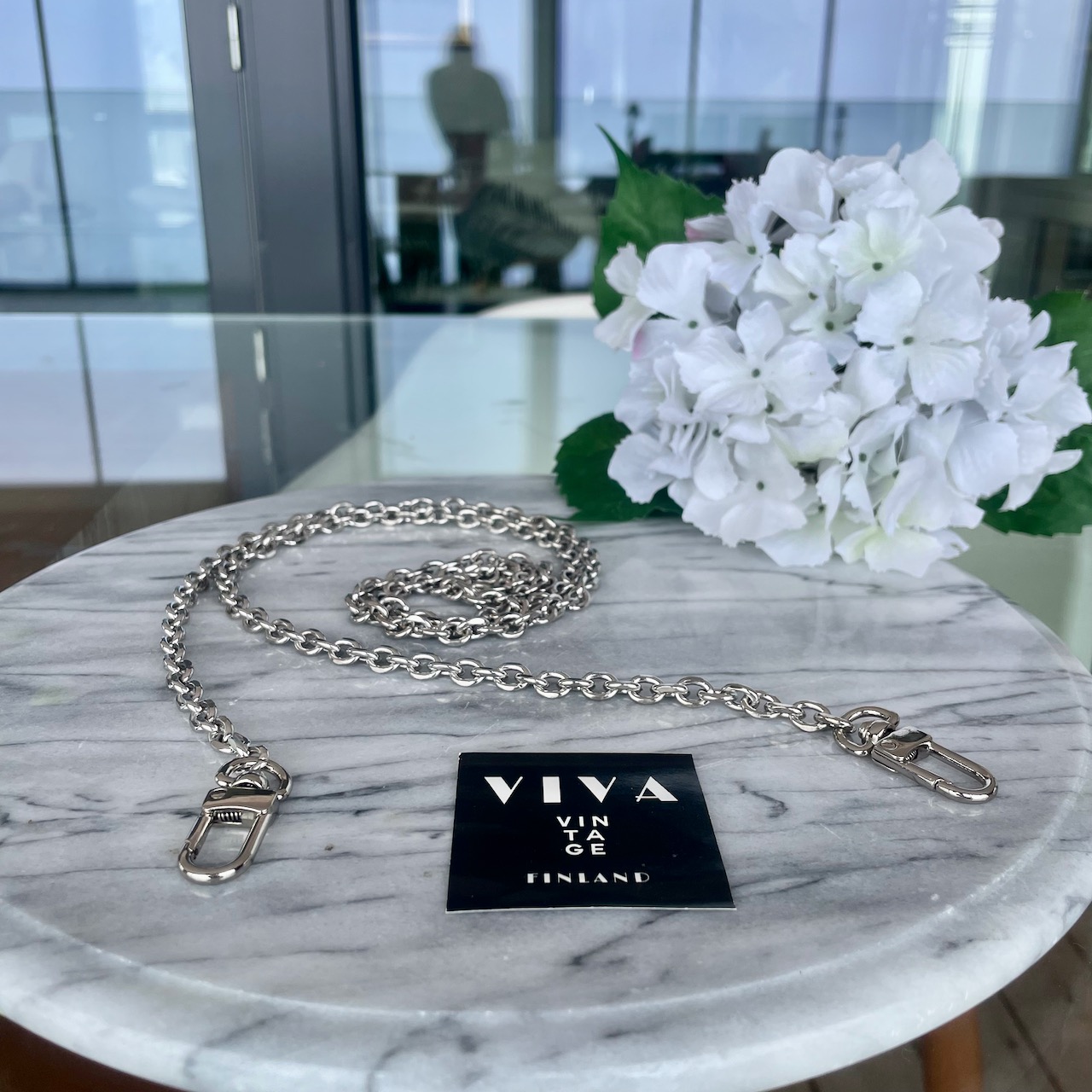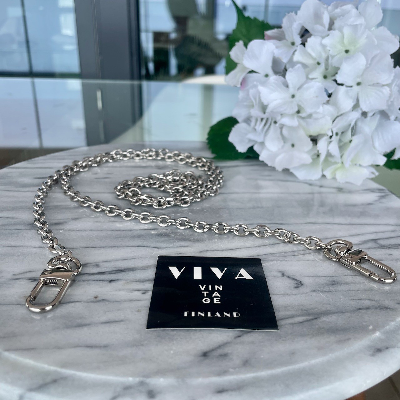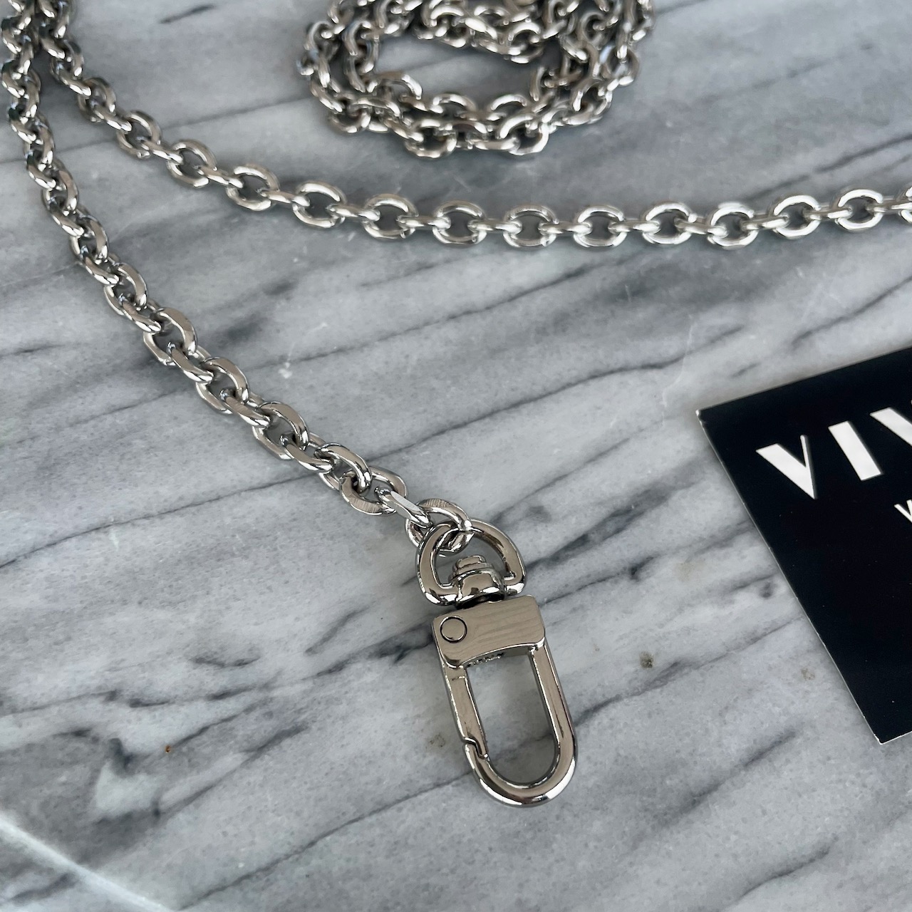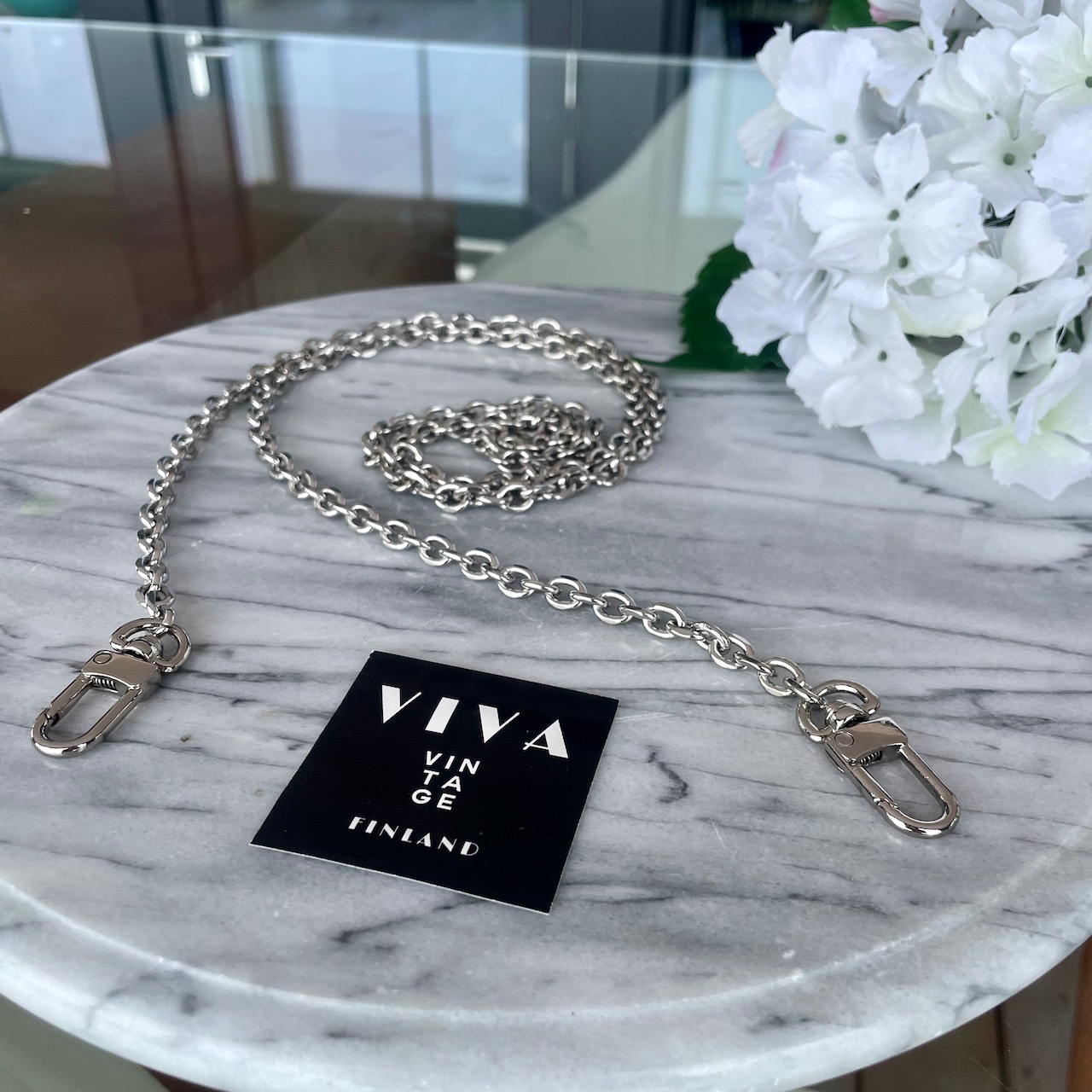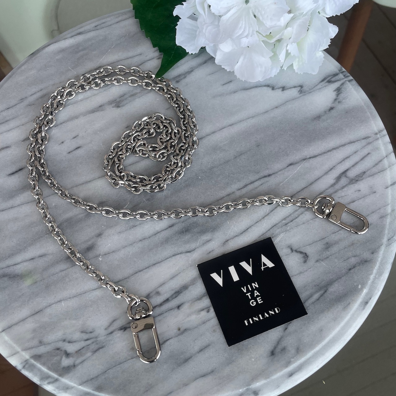Hopeanvärinen ketju laukkuun