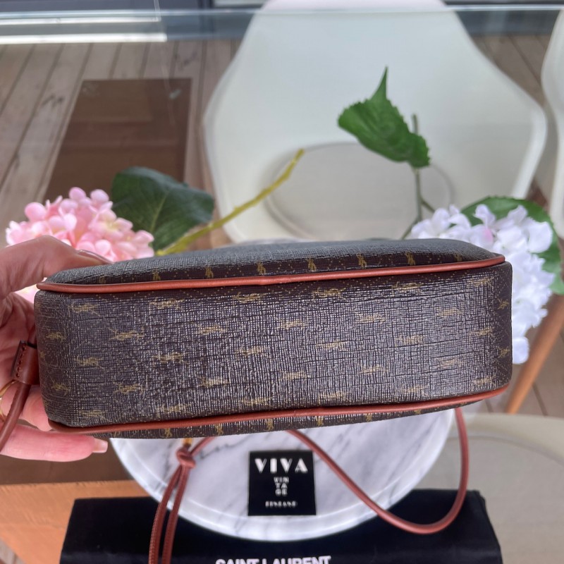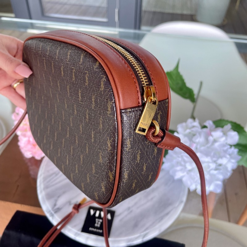 Saint Laurent Le Monogramme mini leather camera bag in chestnut calf leather and all over YSL Monogram print canvas
